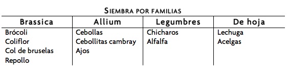 • Una vez seleccionadas las semillas y el sustrato aconsejo acomodar las variedades de acuerdo al tipo de hortalizas, es decir, sembrarás por familias para llevar a cabo la rotación de plantas cuando sea necesario. Esto asegurará que las plagas y enfermedades no sean tan exitosas y una buena salud para cada cosecha. Ej: