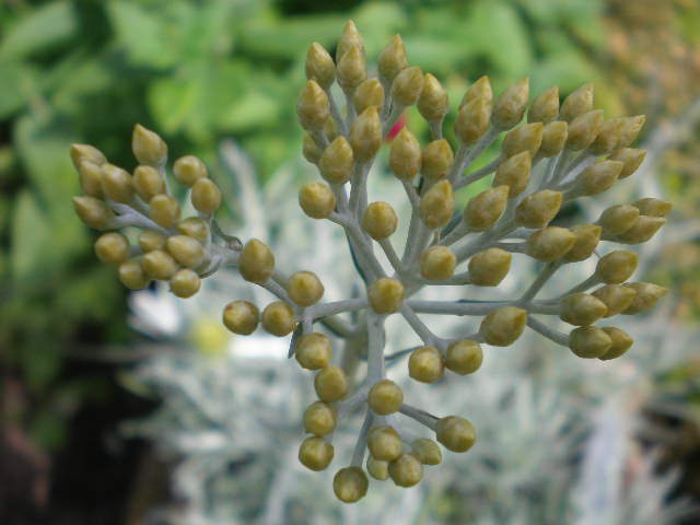 - Sus flores son duraderas y retienen la textura y el color aún secas. Son amarillas y en forma de botón, aparecen en verano.