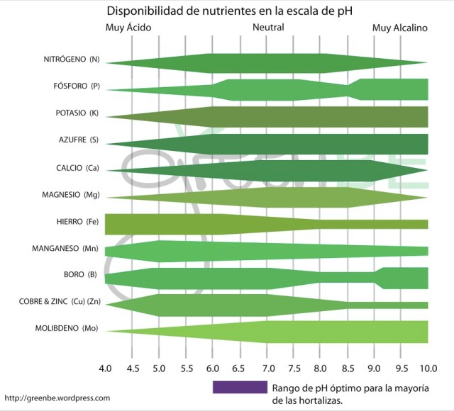 Cuando el pH del suelo está por debajo del 6 la disponibilidad de nutrientes como calcio, fósforo, boro y magnesio disminuye afectando hojas jóvenes y frutos de la planta. Por el contrario, se encontrarán más disponibles nutrientes como zinc, hierro cobre o manganeso. Es importante saber que esta ley aplica tanto para el suelo en el caso de la agricultura orgánica como para la solución nutritiva en el caso de la hidroponía.