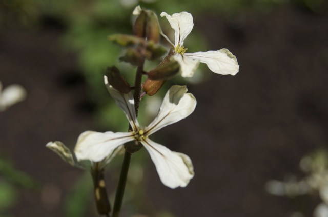 - Flores pequeñas de cuatro pétalos de color blanco y con el centro color violeta, las cuales aparecen a finales de invierno y principios de verano.