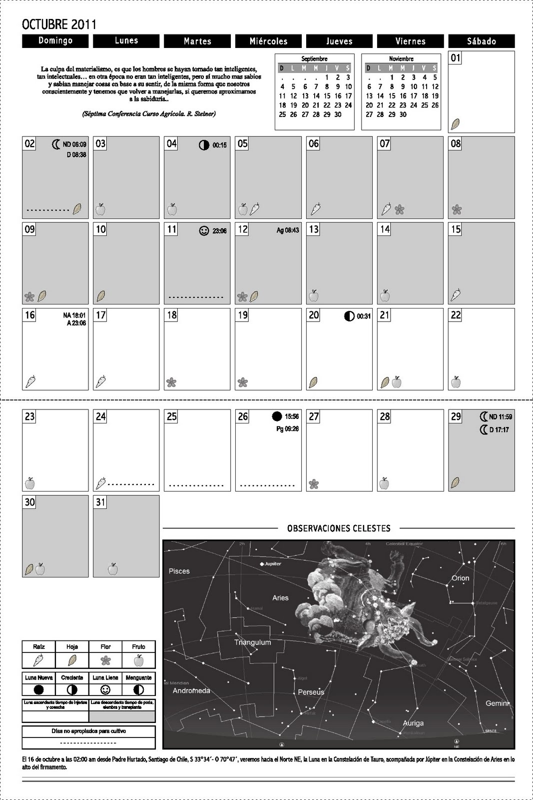 Entonces, como todos los meses, les dejo el calendario biodinámico del mes de octubre. Una adaptación de René Piamonte para el hemisferio sur del calendario de M. Thun.
