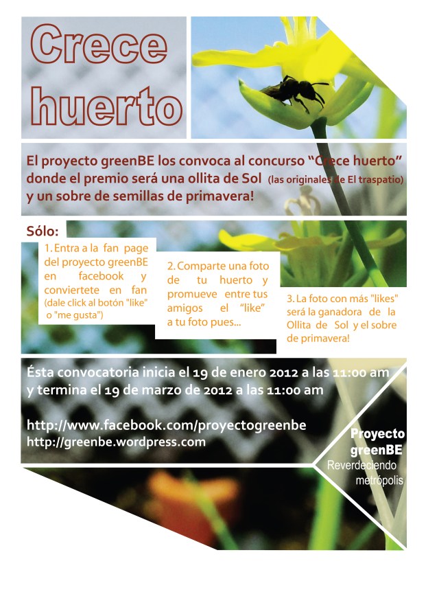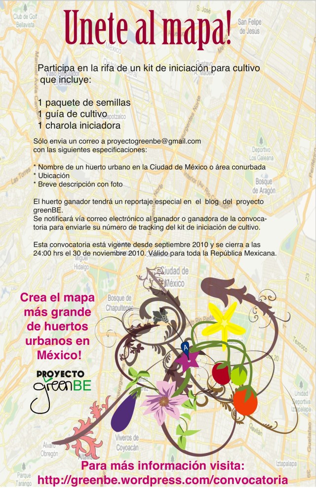 Aquellos que deseen agregar su huerto y no llegaron a la convocatoria son bienvenidos. Pueden enviar los datos a proyectogreenbe@gmail.com; la única finalidad de hacer el mapa es que la gente vaya observando por medio deléste la facilidad de tener un huerto urbano en nuestro país.